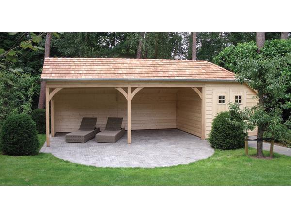 Deze constructies met grote zijluifel, opgebouwd met eiken palen, typeren zich aan hun afgeschuind zijdak. Dit zorgt voor een warm landelijk karakter. Naast de bergruimte heb je ook nog een zeer ruime zijluifel (tot 6m) opgebouwd met eiken plalen van 12x12 cm, ideaal te gebruiken als overdekt terras of buitenkeuken. De keuze ligt volledig bij jou.