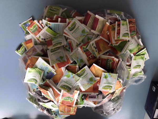 Honderden theezakjes van Pickwick, G’woon , Plus, Twinings , Clipper , Pukka , Numi en andere merken , allemaal leeg en in diverse soorten en kleuren .