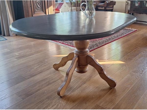 Grenen eettafel, robuust en landelijk. Het bovenblad is grijs geschilderd (wel wat slijtage).