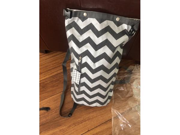 hoogte 53 cm----breedte 38 cm --met voorzak met rits --kaartje eraan merk RALPH BOYER --met druk knoop sluiting kleur grijs met wit gestreept gevoerd met aluminium doek houd je drinken en brood koel