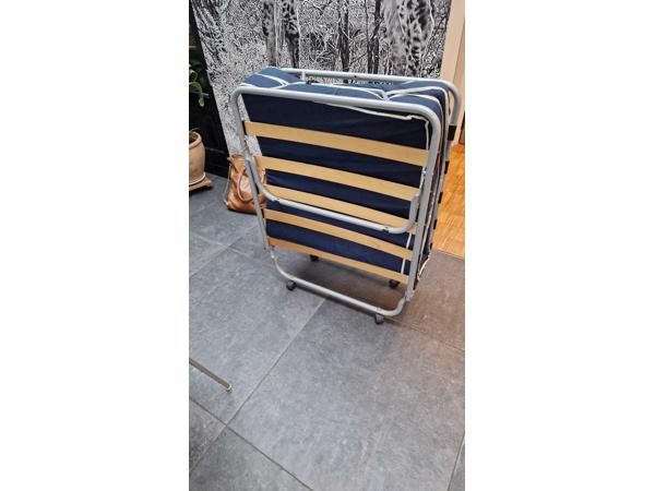 Opklapbed met matrasje. Te gebruiken als bijzetbed voor kinderen.Maten: 80 bij 190 cm. Lattenbodem. 2 beschadigde latten, maar goed te repareren. Indien gewenst wordt reparatie uitgevoerd in overleg. Levering ook in overleg.