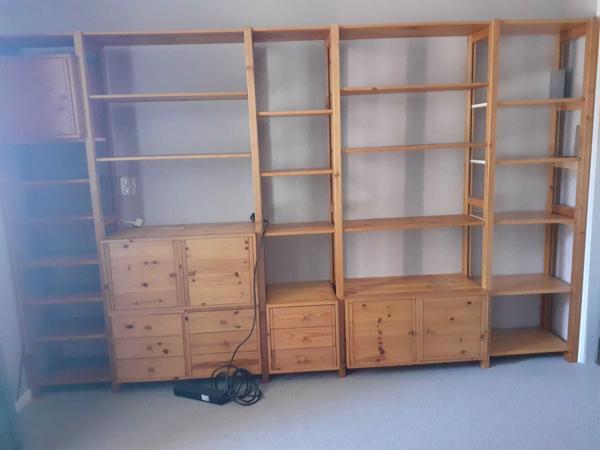 Gebruikt, maar nog in goede, degelijke staat. Het ideale bergmeubelsysteem voor uw boeken of lp's! Het zijn twee stellages. De bovenste foto's vormen van rechts naar links een kast op één wand, de onderste foto's beslaan ook een hele wand. Zelf demonteren en meenemen.