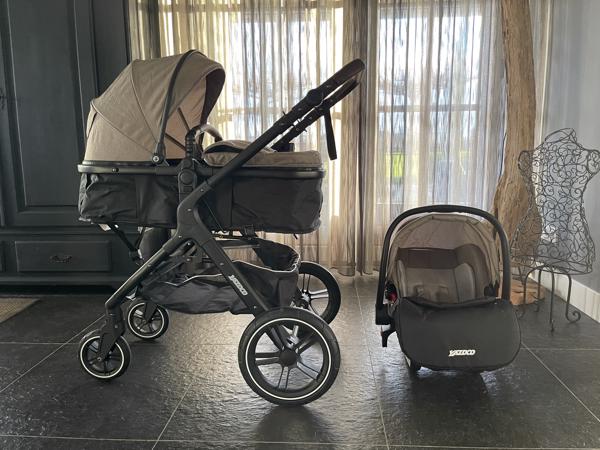 • Wandelwagen met kuipstoel + wieg + autostoel • De stoel kan naar voren of naar achteren gericht worden • Gemakkelijk op te vouwen tot een compact formaat • Rugleuningverstelling van zit-naar ligpositie • Matras voor wieg inbergepen • Universele adapter voor het monteren van autostoeltje • Verstelbare handgreep