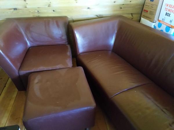 Mooie echt leren bank in goede conditie met lichte gebruikssporen. Afmetingen: Bank lengte 156 cm en breedte 81 cm en hoogte 74 cm Stoel breedte 81 cm en lengte 81 cm en hoogte 74 cm Poef 54 cm bij 54 cm en hoogte 43 cm