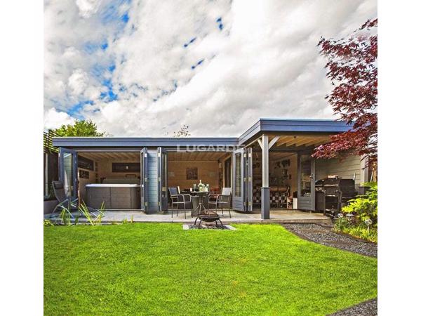 Dit indrukwekkende tuinhuisje met luifel en vouwdeuren brengt uw tuin naar een hoger niveau. De vouwdeuren zorgen voor veel natuurlijk licht en verbinden het tuinhuis ook onzichtbaar met uw tuin wanneer deze geopend zijn. Is er een tuinhuis dat beter geschikt is voor een buitenlounge en een spa met een bubbelbad?