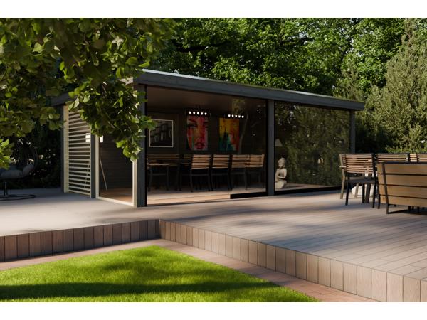 Tuinhuis PS81 biedt een ruim en gezellig onderkomen in het comfort van je eigen tuin. De transparante wanden van glas en hout omarmen de schoonheid van het buitenleven, waardoor natuurlijk licht het interieur overspoelt. Maak van dit zomerhuis je persoonlijke toevluchtsoord en geniet in stijl van de warme zonnestralen en koele briesjes.