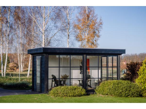 Ons PSD17 tuinhuis van douglas hout is uitstekend als zomerhuis te gebruiken. Het is ontworpen met een modern plat dak en elegante glazen wanden en schuifwanden met steel-look.