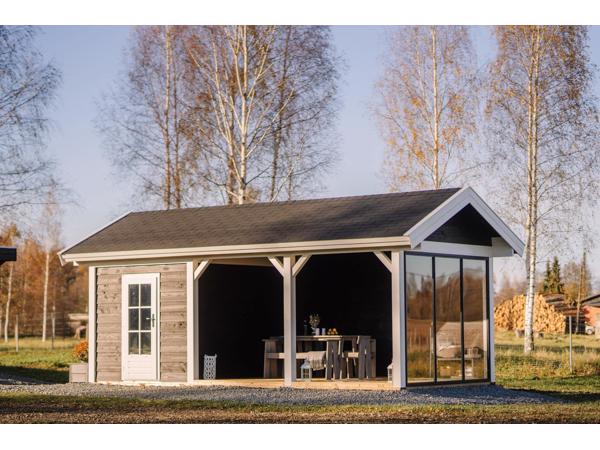 Het tuinhuis PSD22 met luifel presenteert zich als een exclusieve buitenoase, gemaakt van hoogwaardig douglas hout. Met een open luifel aan de voorkant, een gesloten houten wand aan de achterkant en een vaste glaswand aan de zijkant creëert het een uitnodigend terras voor ontspannende uren in de buitenlucht.