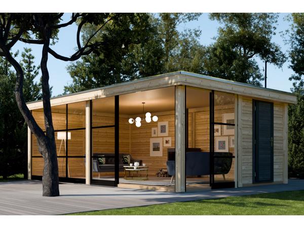 Het tuinhuis PSL20, gebouwd met het gepatenteerde Lugarde Pro systeem en gemaakt van hoogwaardig Europees larikshout, presenteert zich als een eigentijds ruimteconcept. De voorkant en een zijkant van de ruimte maken indruk met moderne glazen schuifwanden in een trendy steel-look, terwijl de rest van het huis wordt afgeschermd door stevige houten wanden. Het platte dak zorgt voor een moderne strakke uitstraling.