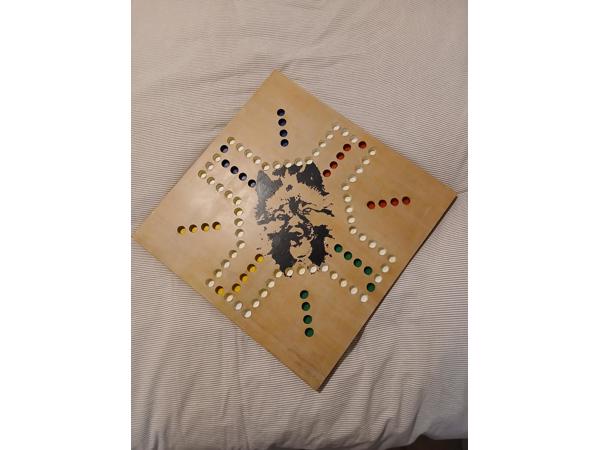 Mens erger je niet spel. Homemade. Met kop van een Husky erop geschilderd. Pionnen zitten erbij. Is gratis maar als je een zakje drop meeneemt vind ik dat niet erg. Zonder is uiteraard ook goed.