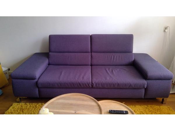 Ruime 2/3 zits bank, kleur donkerpaars. Ik heb hem al een tijdje, maar is nog in goede staat. Op de foto's lijkt de kleur verschoten, maar dat is niet zo. Verstelbare armleuningen en hoofdsteunen. zilverkleurige metalen blokpootjes. Heb er altijd veel plezier van gehad, maar ik wil mijn huiskamer nu in een wat andere stijl inrichten.