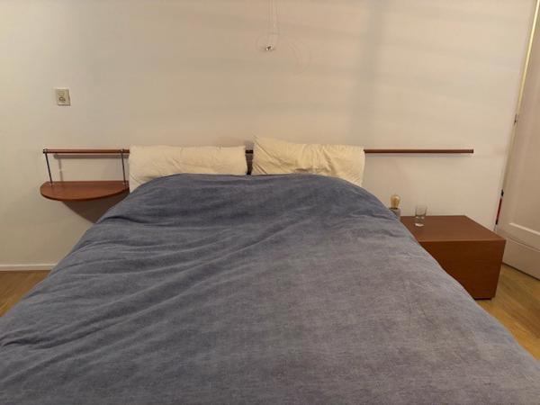 bed ziet er ondanks gebruikssporen netjes en goed uit. Een bijpassend ladenblok 70cm breed, 47 cm diep en aan de andere zijde een bijpassend hangend blad aan stang achter bed. Kussens aan hoofdzijde in stevig wit/beige katoen zijn los te maken en wasbaar.