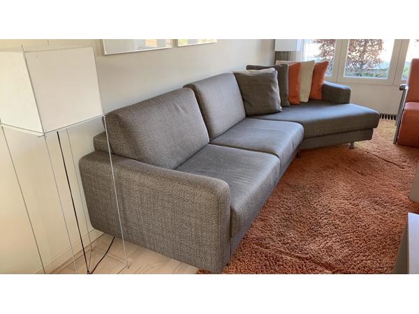 Ruime en comfortabele hoekbank met een lounge gedeelte. De bank is in goede staat en biedt veel zitruimte, ideaal voor een gezellige woonkamer. De afmetingen zijn: 340 cm lang, 90 cm diep en het lounge gedeelte is 155 cm diep. De losse kussens zijn inbegrepen.