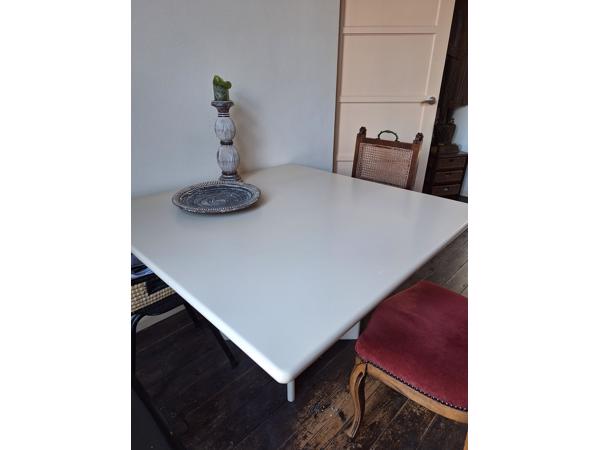 Fijne eet-/werktafel. 1.20×1.20×0.75 (lxbxh). Oorspronkelijk wit, maar door mij in een hele lichte zandkleur geschilderd. Eenvoudig overschilderbaar. Poten staan gekruist, dus veel beenruimte.