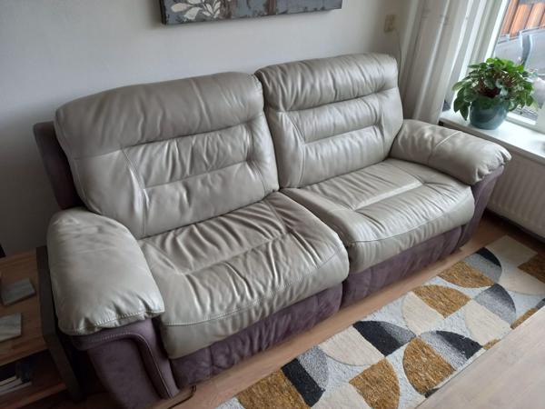 Fraaie electrisch verstelbare lederen bank. Kleur grijs met bruine stoffen accenten in zijkant en voetensteun. Bediening via druktoetsen aan zijkant met USB aansluiting.