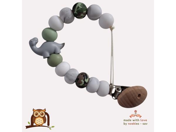 Thema Dino. Speenkoord met dino en camouflage kralen in de kleuren grijs, khaki, groen, wit. Met deze speenkoord, raakt je kleintje zijn of haar speentje niet meer kwijt. De handige stevige klip is bedoeld voor aan de kledingstukken die je kind draagt, autostoelgordel, kinderwagen. Voor zowel thuis gebruik als voor onderweg. Totale lengte 28cm. Erg leuk om cadeau te geven. Niet geschikt als speelgoed of bijtring. Laat je kleintje nooit alleen ermee. Het speentje kan ook niet meer op de grond vallen. Speenkoorden mogen volgends NEN12586 veiligheidnorm, inclusief lus, zonder clip, maximaal 22 cm lang zijn. - Noekies .com kan niet aansprakelijk worden gesteld voor enige schade, letsel of ongelukken die voortvloeien uit het gebruik van dit speenkoord, zowel direct als indirect. Een speenkoord Is niet bedoeld om op te bijten. Het gebruik van een speenkoord is op eigen verantwoordelijkheid.
