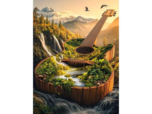 Mooie Diamond Painting gitaar met boslandschap. Vierkante Steentjes. Deze Diamond Painting is 50x40cm. Painting vlak is 45x35cm. Vierkante diamantjes.