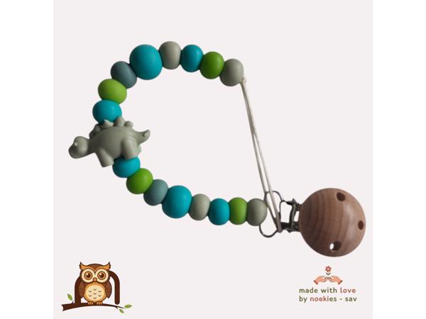 Handgemaakt. Thema Dino. Speen koord met dino in de kleuren turquoise khaki groen. Met deze speenkoord, raakt je kleintje zijn of haar speentje niet meer kwijt. De handige stevige klip is bedoeld voor aan de kledingstukken die je kind draagt, autostoelgordel, kinderwagen. Voor zowel thuis gebruik als voor onderweg. Totale lengte 28cm. Erg leuk om cadeau te geven. Niet geschikt als speelgoed of bijtring. Laat je kleintje nooit alleen ermee. Het speentje kan ook niet meer op de grond vallen. Speenkoorden mogen volgends NEN12586 veiligheidnorm, inclusief lus, zonder clip, maximaal 22 cm lang zijn. - Noekies .com kan niet aansprakelijk worden gesteld voor enige schade, letsel of ongelukken die voortvloeien uit het gebruik van dit speenkoord, zowel direct als indirect. Een speenkoord Is niet bedoeld om op te bijten. Het gebruik van een speenkoord is op eigen verantwoordelijkheid.