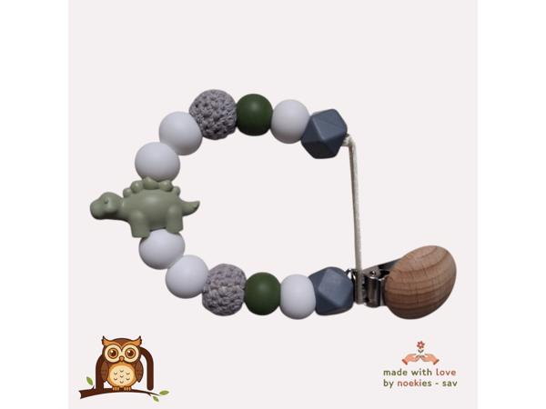 Handgemaakt. Thema Dino. Speenkoord met khaki groene dino, en 2 wollige kralen. Overige kleuren grijs wit. Met deze speenkoord, raakt je kleintje zijn of haar speentje niet meer kwijt. De handige stevige klip is bedoeld voor aan de kledingstukken die je kind draagt, autostoelgordel, kinderwagen. Voor zowel thuis gebruik als voor onderweg. Totale lengte 28cm. Erg leuk om cadeau te geven. Niet geschikt als speelgoed of bijtring. Laat je kleintje nooit alleen ermee. Het speentje kan ook niet meer op de grond vallen. Speenkoorden mogen volgends NEN12586 veiligheidnorm, inclusief lus, zonder clip, maximaal 22 cm lang zijn. - Noekies .com kan niet aansprakelijk worden gesteld voor enige schade, letsel of ongelukken die voortvloeien uit het gebruik van dit speenkoord, zowel direct als indirect. Een speenkoord Is niet bedoeld om op te bijten. Het gebruik van een speenkoord is op eigen verantwoordelijkheid.