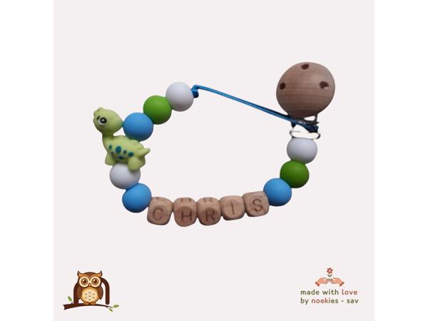 Handgemaakt. Welke naam is voor jou wondertje? De siliconen kralen zijn een mix van groen, blauw, en witte kleuren met groene dino. De letterkralen zijn van beukenhout. De kralen zijn volledig BPA-vrij, PVC-vrij, lood-vrij en ftalaat-vrij. Met deze op naam gemaakte speenkoord, raakt je kleintje zijn of haar speentje niet meer kwijt. De handige stevige klip is bedoeld voor aan de kledingstukken die je kind draagt, autostoelgordel, kinderwagen. Voor zowel thuis gebruik als voor onderweg. Erg leuk om cadeau te geven. Niet geschikt als speelgoed of bijtring. Laat je kleintje nooit alleen ermee. Nooit meer het favoriete speentje kwijtraken door zo'n handig speenkoord. Het speentje kan ook niet meer op de grond vallen. Hygiënisch, hip en gepersonaliseerd met naam! Als de naam langer dan 5 letters is (max 9 letters) kan er een aanpassing aan het speenkoord gemaakt worden. Speenkoorden mogen volgends NEN12586 veiligheidnorm, inclusief lus, zonder clip, maximaal 22 cm lang zijn. Noekies .com kan niet aansprakelijk worden gesteld voor enige schade, letsel of ongelukken die voortvloeien uit het gebruik van dit speenkoord, zowel direct als indirect. Een speenkoord Is niet bedoeld om op te bijten. Het gebruik van een speenkoord is op eigen verantwoordelijkheid.