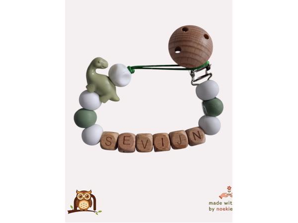 Handgemaakt. Welke naam is voor jou wondertje? De siliconen kralen zijn een mix van wit en khaki groene kleuren met vrolijk dino langnek. De letterkralen zijn van beukenhout. De kralen zijn volledig BPA-vrij, PVC-vrij, lood-vrij en ftalaat-vrij. Met deze op naam gemaakte speenkoord, raakt je kleintje zijn of haar speentje niet meer kwijt. De handige stevige klip is bedoeld voor aan de kledingstukken die je kind draagt, autostoelgordel, kinderwagen. Voor zowel thuis gebruik als voor onderweg. Erg leuk om cadeau te geven. Niet geschikt als speelgoed of bijtring. Laat je kleintje nooit alleen ermee. Nooit meer het favoriete speentje kwijtraken door zo'n handig speenkoord. Het speentje kan ook niet meer op de grond vallen. Hygiënisch, hip en gepersonaliseerd met naam! Als de naam langer dan 5 letters is (max 9 letters) kan er een aanpassing aan het speenkoord gemaakt worden. Speenkoorden mogen volgends NEN12586 veiligheidnorm, inclusief lus, zonder clip, maximaal 22 cm lang zijn. Noekies .com kan niet aansprakelijk worden gesteld voor enige schade, letsel of ongelukken die voortvloeien uit het gebruik van dit speenkoord, zowel direct als indirect. Een speenkoord Is niet bedoeld om op te bijten. Het gebruik van een speenkoord is op eigen verantwoordelijkheid.