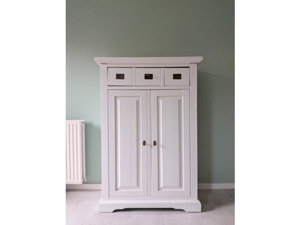 Landelijke opbergkast. Past veel in! Afmetingen: 96 cm breed, 43 cm diep en 141 cm hoog. De kast is van massief hout en erg zwaar! (rekening mee houden met ophalen) Kast moet wat opgeknapt worden: de achterplaat (spaanplaat) is onderaan los, maar kan met een paar spijkertjes weer vastgezet worden. De lade loopt soms wat stroef.