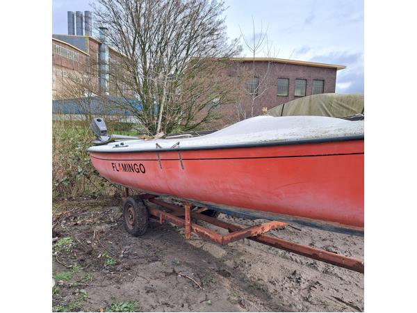 Open zeilboot type Sailhorse 6m, compleet met mast, giek, grootzeil, fok, spinacker, 5pk Suzuki bb motor, dekzeil en een terreintrailer.