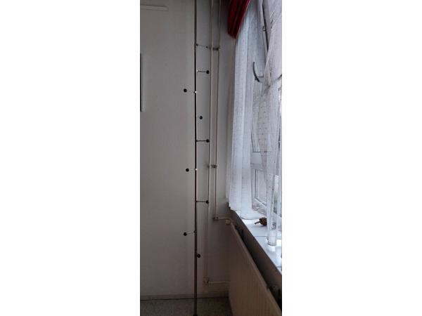 Deze kapstok kan overal worden geplaatst, klemt tussen vloer en plafond. Geschikt voor lichte kledingstukken of sieraden, ceintuurs, tasjes enz. Er ontbreekt 1 haakje. Ophalen in Amsterdam