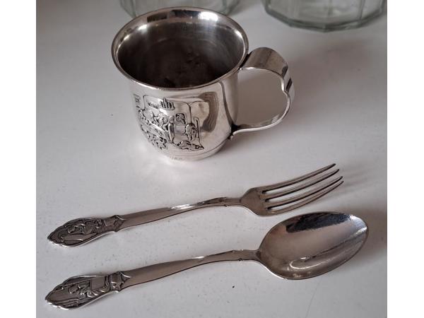 Deze oude prachtige Gero 90 verzilverde geboortebeker met Gero 90 verzilverde vork en lepel die ik ooit heb gekregen, en aan iemand wil geven die er zuinig op is, en het de moeite waard vindt om nog te gebruiken of om als decoratie leuk ergens neer te zetten. En zeker om dat de verzilverde beker en de vork en lepel uit de begin jaren 40 zijn. Er staat een keurmerk in Gero zilver 90. Er staat de naam in van Marijke.