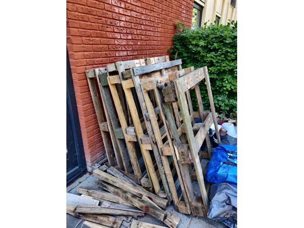 Oude pallets. Planken zijn voor een groot deel gebroken en oud dus waarschijnlijk vooral goed om te gebruiken als brandhout, maar wie weet kun je er nog een paar bruikbare planken uithalen.