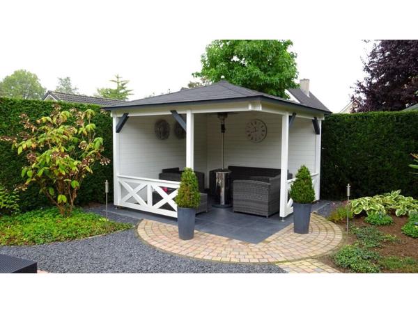 Breedte: 278 cm Diepte: 278 cm Oppervlakte: 7.73 m² Wanddikte: 28 mm Zijwandhoogte: 218 cm Nokhoogte: 272 cm Type dak: Puntdak Houtsoort: Noord-Europees vuren kwaliteitshout Bouwsysteem: Blokhut-systeem