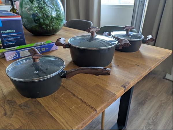 De pannen zijn gebruikt maar je kan er nog prima mee koken.