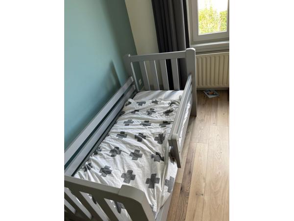 Stevig grijs peuterbedje met opstaande rand zodat je peuter er niet uit valt. Fijn bedje tussen de baby- en de kinderfase. Inclusief bijpassend matrasje, dekbed en beddengoed.
