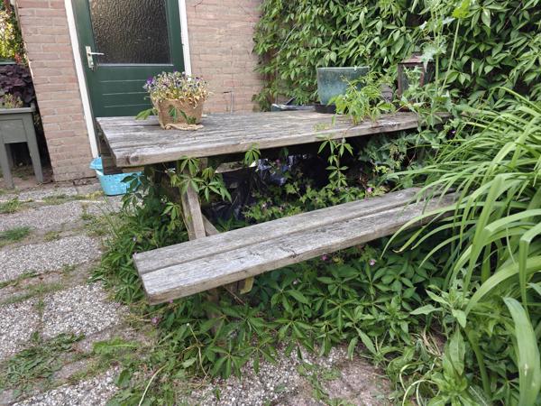 Houten picnicbank, stevig maar heeft wel een opknapbeurt nodig. Wij gebruiken het simpelweg niet dus mag deze mee met iemand die er baat aan heeft. Alleen de picnictafel, niet het decor. ;)