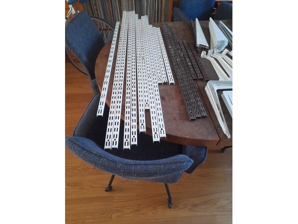 Veel plankdragers, losse en met bijbehorende railsystemen. Variëren in aantallen en qua afmeting van 17 t/m 47 cm. Kleuren wit, bruin en zwart. Zijn o.m. gebruikt voor de inrichting van een driedeurs kledingkast. Ook een set van 6 witte dragers voor aluminium kledingroedes. Afm. van deze dragers 27 cm, bijpassende roedes 2x 78 cm en 1x 60 cm.
