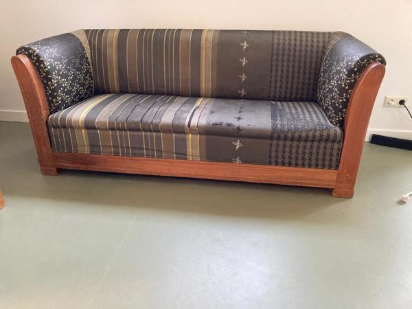 Wegens plaatsgebrek moeten we afscheid nemen van het bankje uit begin 20ste eeuw. Het ontwerp is van Harry Dreesen. Het zit nog steeds goed is nu bekleed met stof van Hella Jongerius. Die is aan vervanging toe. De afmetingen: 1.85 breed x 90 diep en 90 hoog