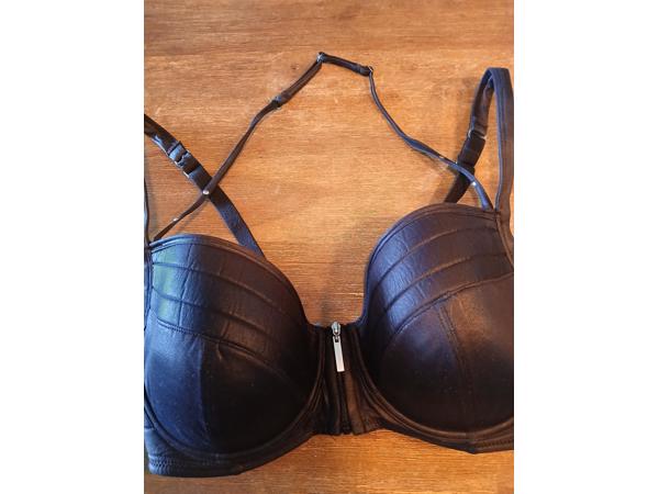 Prachtige zwarte glanzende Sapph bh met ritssluiting voor 85e ( 85d past ook) Met dubbele zwarte bandjes met studs. achtersluiting dmv 2 haakjesBinnenkant is turquoise