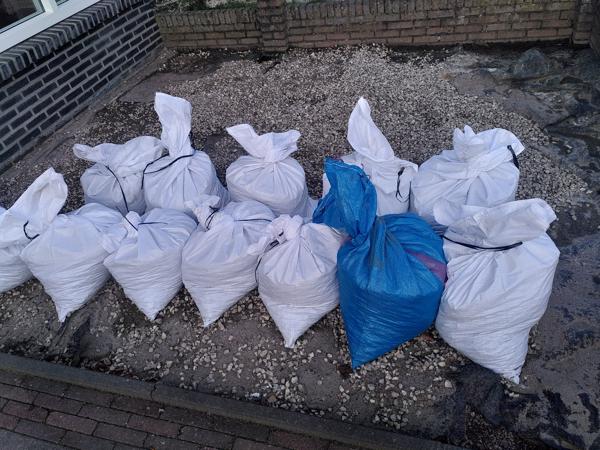 Puinzakken met siergrind. Op ieder gewenste datum en tijdstip op te halen, aangezien het in de voortuin staat. Extra siergrind mag ook nog zelf uit de tuin geschept worden.