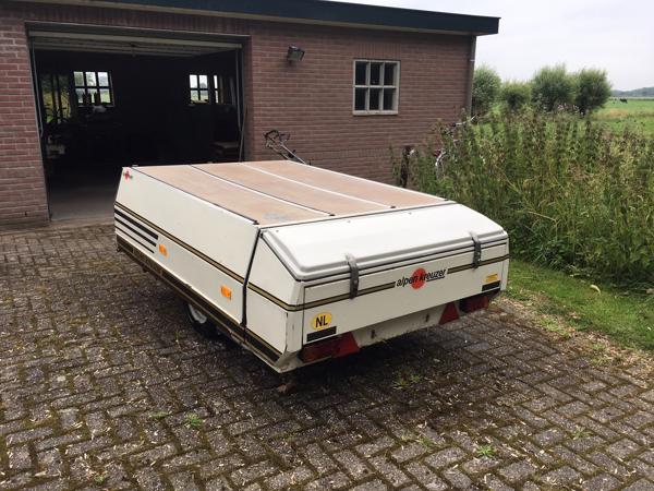 Veertig jaar oude - inmiddels RETRO - vouwwagen van het merk Alpenkreuzer. Heeft wel gebruiksporen. Ideaal voor op de camping van bijv. De Zwarte Cross. De gratis aanbieding is inclusief de vele aanwezige toebehoren.