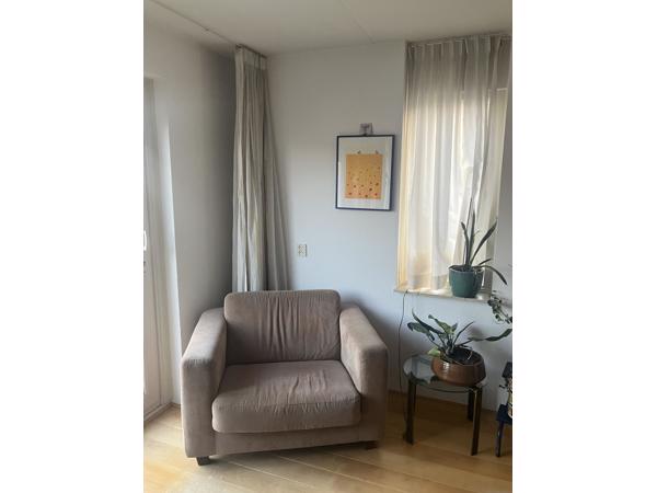 Beige, comfy loveseat (voor 2 personen) te koop! Stoel is lichtelijk beschadigd op de leuningen, maar is beresterk en heeft veel karakter. Lekkere leesstoel, staat leuk in een hoekje.
