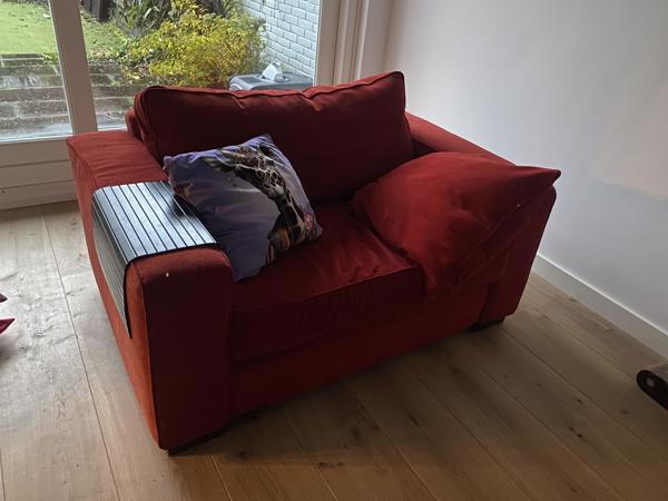 Gratis ophalen, zeer comfortabele rode fluwelen loveseat. Je kan er t best toch in je eentje in zitten, maar met z'n 2-en lukt ook redelijk. Superzachte stof, in best goede staat. Met twee kussens, 1 grote en 1 wat kleinere. We willen hem (op korte termijn) laten ophalen omdat de stoel niet meer in de inrichting past (letterlijk niet)