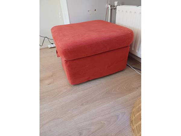 Rode vierkante poef met opbergruimte, formaat 60x60 cm, hoogte 37 cm. Hoes is afneembaarven uitwasbaar. Met extra reservehoes erbij. Gebruikt maar in goede staat.