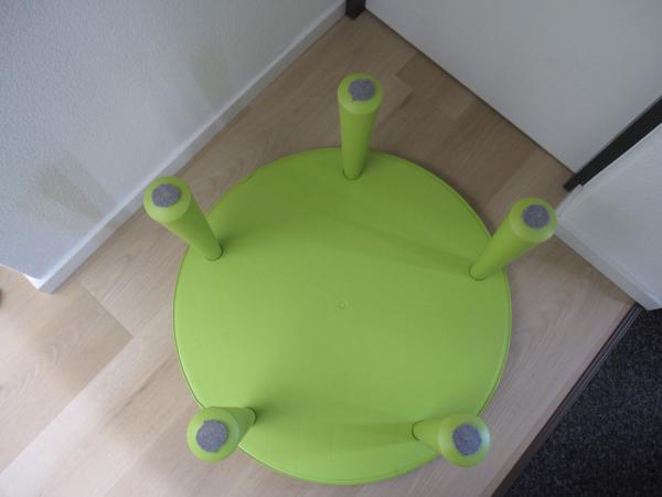 gratis af te halen groene ronde kunststof tafel van Ikea voor kinderen, hoogte circa 50 cm, diameter ca 90 cm, stevige constructie, zonder schade, alleen lichte vlekvorming op tafelblad, regio Zuid-Limburg