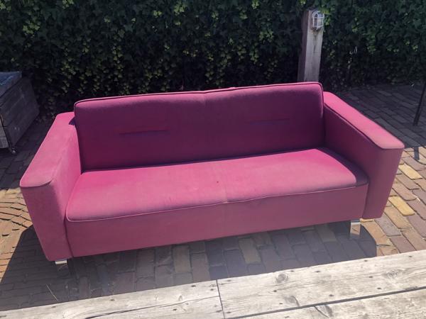Montel design bankstel in roze kleur met zilveren poten. De stof is hier en daar beschadigd, maar de bank zit ontzettend goed. Zeer geschikt dus om op te knappen of met een kleed erover te gebruiken.