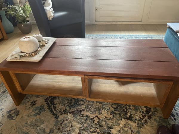 Mooie salontafel, nog in goede staat, niet helemaal mooi geverfd (door mij…) Als je een beetje handig bent, kun je het makkelijk schuren en verven. Er zitten verrijdbare opbergvakken onder.
