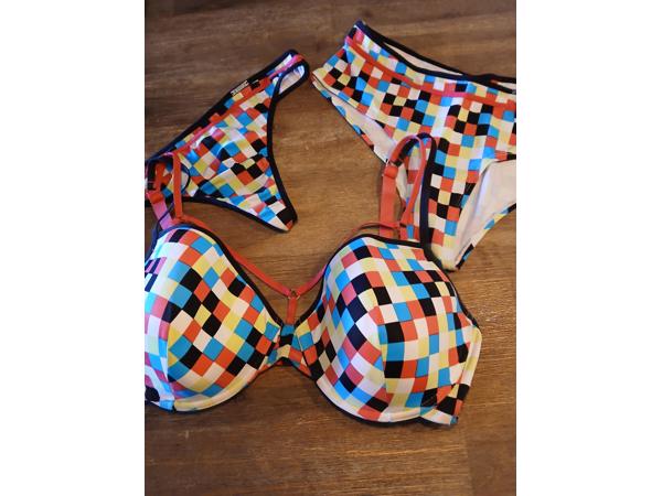 Zgan Sapph bh , string xl en short L in de kleuren zwart wit koraal lime turquoise geblokt en mooi open detail op achterkant vd string/ short .Prachtige set voor jou ??? .