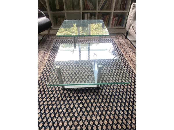 Twee vierkante glazen salontafels die als set en eventueel los van elkaar geplaatst kunnen worden..Ze zijn van zware kwaliteit. De glaspaten zijn anderhalf centimeter dik. Afmetingen van beide tafels zijn 60 x60 cm. De hogere tafel is 41 cm hoog. De lagere tafel is 41 m hoog.