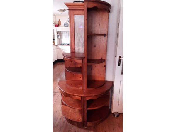 Set van 4 hoekkastjes. Materiaal: Grenen/Vuren. De onderdelen zijn eventueel ook samen tegen elkaar te gebruiken. Met gebruikssporen (ca. 25 jaar oud).
