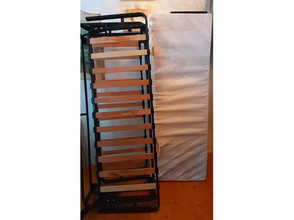 Inklapbare slaapbank met lattenbodem, 1.20x200m. Aan de onderkant van de matras zijn twee naadjes van de vaste hoes losgeraakt. Zit en slaapt goed.