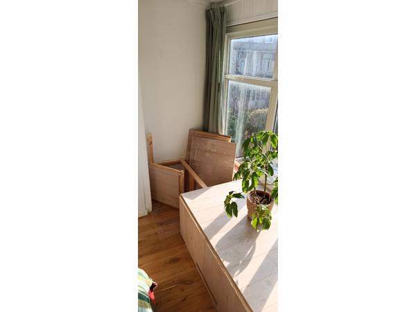 Handgemaakt houten platform van zeer stevig kwaliteits­hout (geen massief blokhout, maar sterke duurzame planken). Werd gebruikt als bed- en zitpodium bij het raam.
